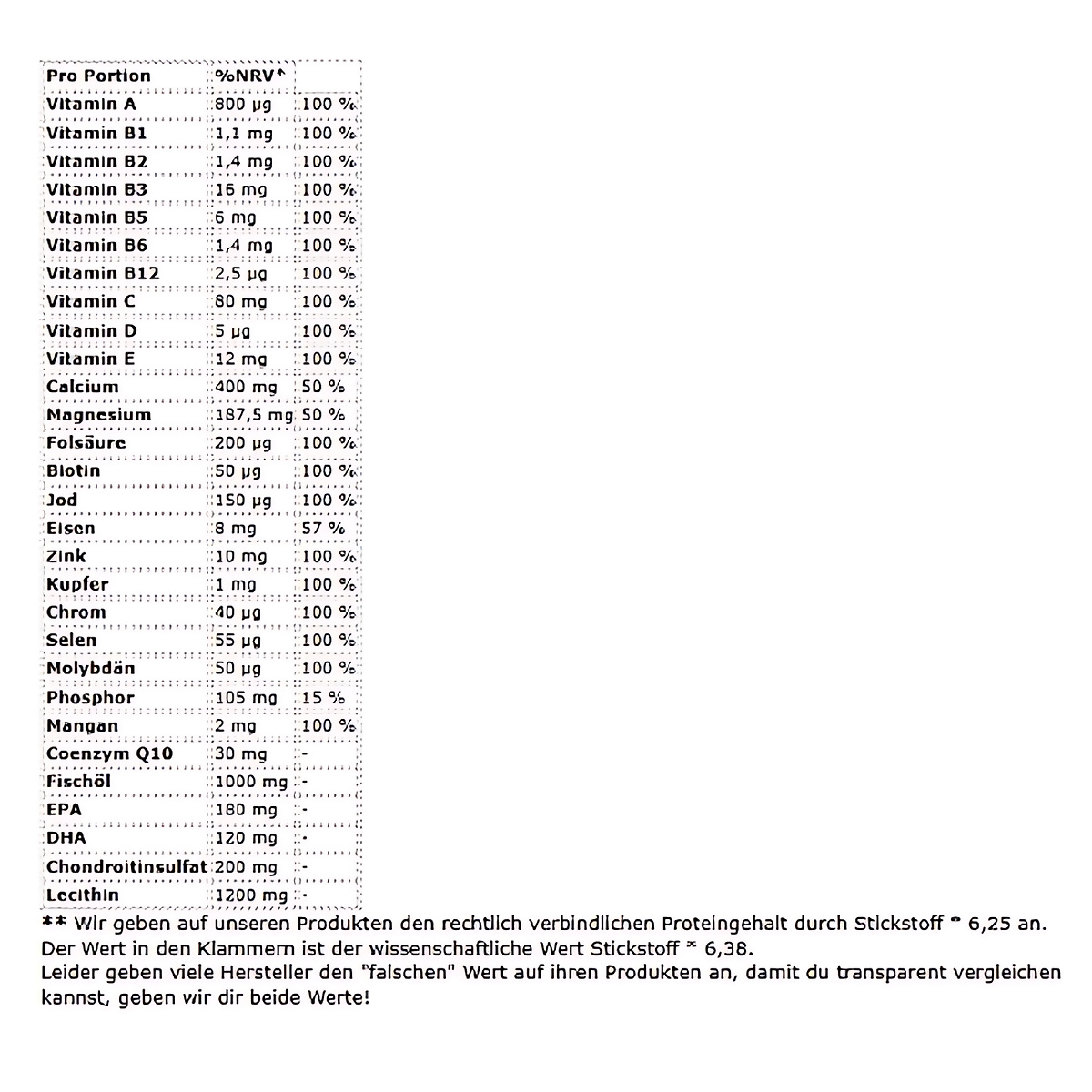 Inhaltsstoff Menge pro Portion (1 Tagesbeutel) Fischöl 1000 mg (davon EPA 180 mg, DHA 120 mg) Coenzym Q10 50 mg Vitamin E (gesamt) 30 mg Glucosaminsulfat 300 mg (davon Glucosamin 195 mg) Chondroitinsulfat 200 mg MSM 100 mg Vitamin C (gesamt) 1000 mg Hagebuttenpulver 50 mg Lecithin 1200 mg Kalzium (gesamt) 660 mg Magnesium (gesamt) 375 mg Zink (gesamt) 12,5 mg Phosphor (gesamt) 355 mg Kupfer 1,33 mg Bor 0,25 mg Eisen 8 mg Jod 100 µg Selen 50 µg Chrom 50 µg Molybdän 50 µg Vitamin A 265 µg Vitamin D 10 µg Vitamin K1 60 µg Vitamin B1 3 mg Vitamin B2 3 mg Vitamin B3 (Niacin) 35 mg Vitamin B5 (Pantothensäure) 12 mg Vitamin B6 4 mg Folsäure 400 µg Vitamin B12 2 µg Biotin 300 µg