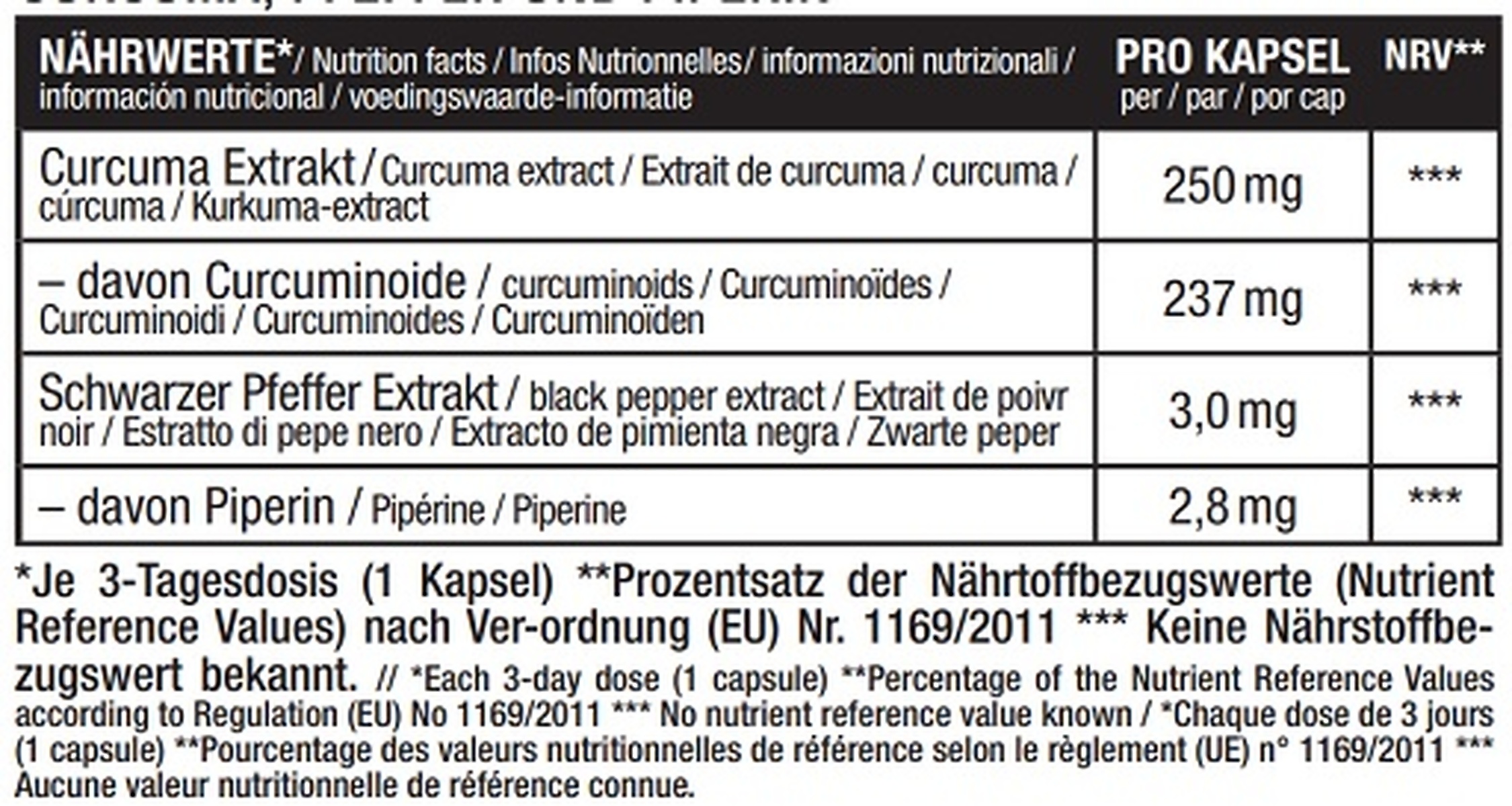 Curcuma Extrakt, Kapselhülle Hydroxypropylmethylcellulose, Füllstoff mikrokristalline Cellulose, schwarzer Pfeffer Extrakt