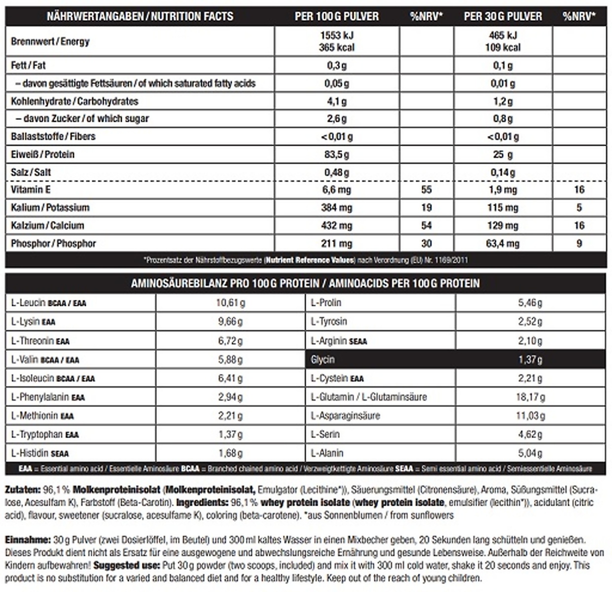 Unser fruchtig, frisches Juicy Isolat besteht zu 93 bis 96 % (je nach Geschmack) aus hochwertig verarbeitetem Molkenproteinisolat und liefert dir pro 100g bis zu 83g Eiweiß