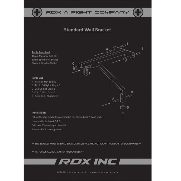 Kompakt und schwer. Der geschweißte P-Coated HG-Steel von RDX® ist robust und langlebig. Die mit der H-CR Anti-Rost-Formulierung behandelte Allwetter-Wandhalterung kann bis zu 40 kg am befestigten d-Schkel am Ende des 42 cm langen Arms (weg von der Wand) halten. Montageanleitung und alle notwendigen Wandbefestigungen sind inklusive. Diese Halterung setzt den Standard Für ein allumfassendes Saisontraining.