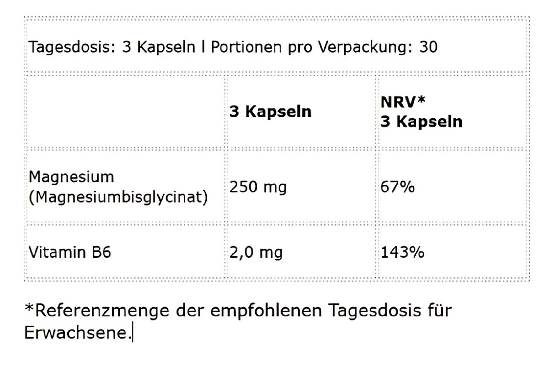 Nährwertangaben: 3 Kapseln NRV* 3 Kapseln Magnesium (Magnesiumbisglycinat) 250 mg 67% Vitamin B6 2,0 mg 143% * Referenzmenge der empfohlenen Tagesdosis für Erwachsene.