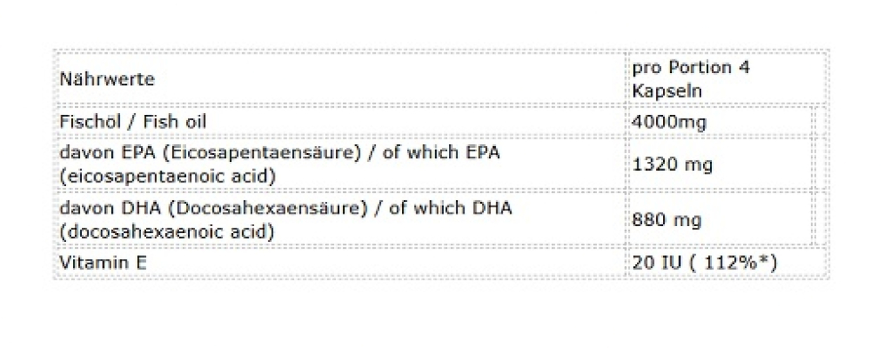 • Fischöl: 4000 mg EPA (Eicosapentaensäure): 1320 mg DHA (Docosahexaensäure): 880 mg Vitamin E: 20 IU (112 % NRV)
