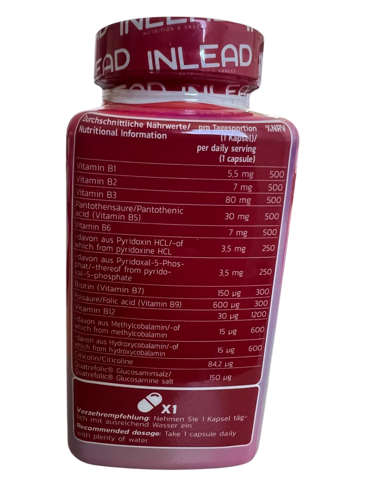 Nährwertangaben: Nährwerttabelle 1 Kapsel %NRV Vitamin B1 5,5 mg 500 Vitamin B2 7 mg NE 500 Vitamin B3 80 mg 500 Pantothensäure/(Vitamin B5) 30 mg 500 Vitamin B6 7 mg 500 - davon aus Pyridoxin HCL 3,5 mg 250 - davon aus Pyridoxal-5-Phosphat 3,5 mg 250 Biotin (Vitamin B7) 150 µg RE 300 Folsäure/(Vitamin B9) 600 µg 300 Vitamin B12 30 µg 1200 - davon aus Methylcobalamin 15 µg 600 - davon aus Hydroxycobalamin 15 µg 600 Citicolin 84,2 µg Quatrefolic® Glucosaminsalz 150 µg *Prozent der empfohlenen täglichen Verzehrmenge laut Verordnung (EU) Nr. 1196/2011 **Keine Nährstoffbezugswerte (NRV) vorhanden.