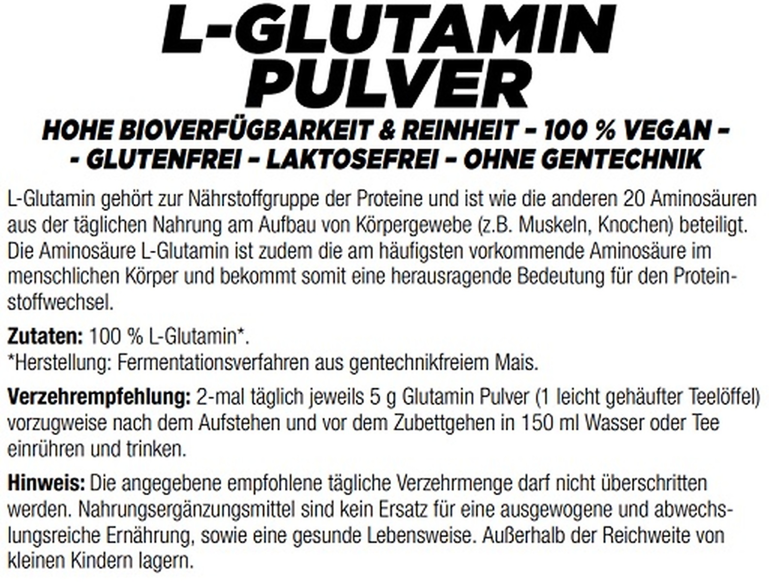 Verzehrempfehlung: 2-mal täglich jeweils 5g Glutamin Pulver (1 leicht gehäufter Teelöffel) vorzugsweise nach dem Aufstehen und vor dem Zubettgehen in 150ml Wasser oder Tee einrühren und trinken.