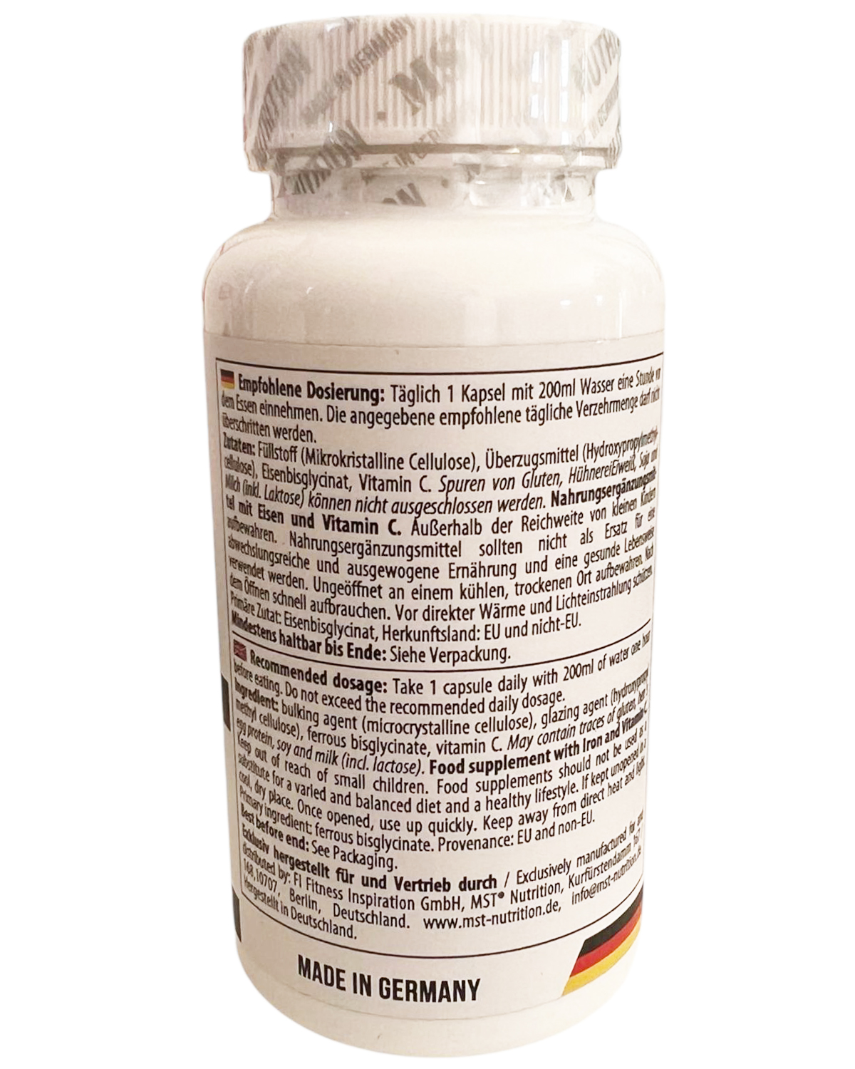 MST - Iron Bisglycinate Kapseln enthalten eine hochwertige Form von Eisen, die gut vom Körper aufgenommen wird. Eisen ist ein wichtiges Spurenelement, das zur normalen Bildung von roten Blutkörperchen und Hämoglobin beiträgt.