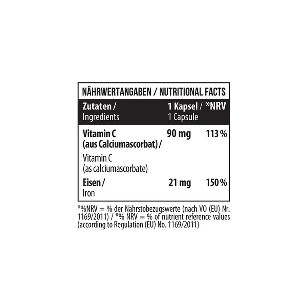 Vitamin C, Eisenbisglycinat, Füllstoff (Mikrokristalline Cellulose), Überzugsmittel (Hydroxypropylmethylcellulose)