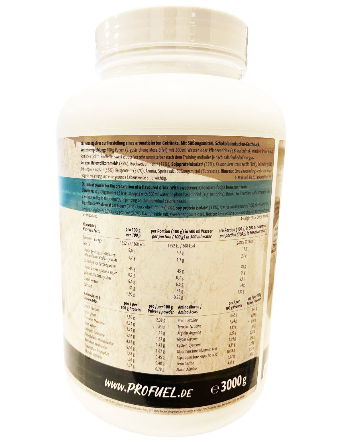 Hafervollkornmehl¹ (35%), Proteinmischung (25%) (Sojaproteinisolat², Erbsenproteinisolat¹, Reisprotein²), Buchweizenmehl¹ (17,0%), Kakaopulver stark entölt (10,0%), Reismehl¹ (10,0%), Aroma, Speisesalz, Süßungsmittel (Sucralose). 1: Herkunft EU. 2: Herkunft Nicht-EU.