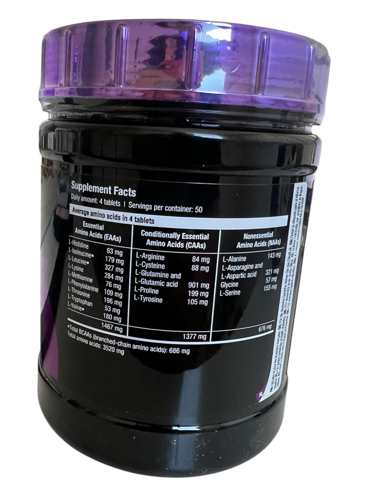 • Nährwertangaben: Portionsgröße: 4 Tabletten (je 1.4 g) pro Portion (4 Tabletten) pro Portion (4 Tabletten) Typisches Aminosäurenprofil pro Portion Alanin 160 mg Lysin** 316 mg Arginin 77 mg Methionin** 78 mg Asparaginsäure 352 mg Phenylalanin** 110 mg Cystin 66 mg Prolin 209 mg Glutaminsäure 627 mg Serin 162 mg hinzugefügtes L-Glutamin 280 mg Threonin** 214 mg Glycin 48 mg Tryptophan** 46 mg Histidin 63 mg Tyrosin 102 mg Isoleucin**+ 210 mg Valin**+ 204 mg Leucin**+ 352 mg Aminosäuren insgesamt: 3676 mg pro Portion **Essenzielle Aminosäuren: 1530 mg pro Portion +Verzweigtkettige Aminosäuren (BCAAs): 766 mg pro Portion