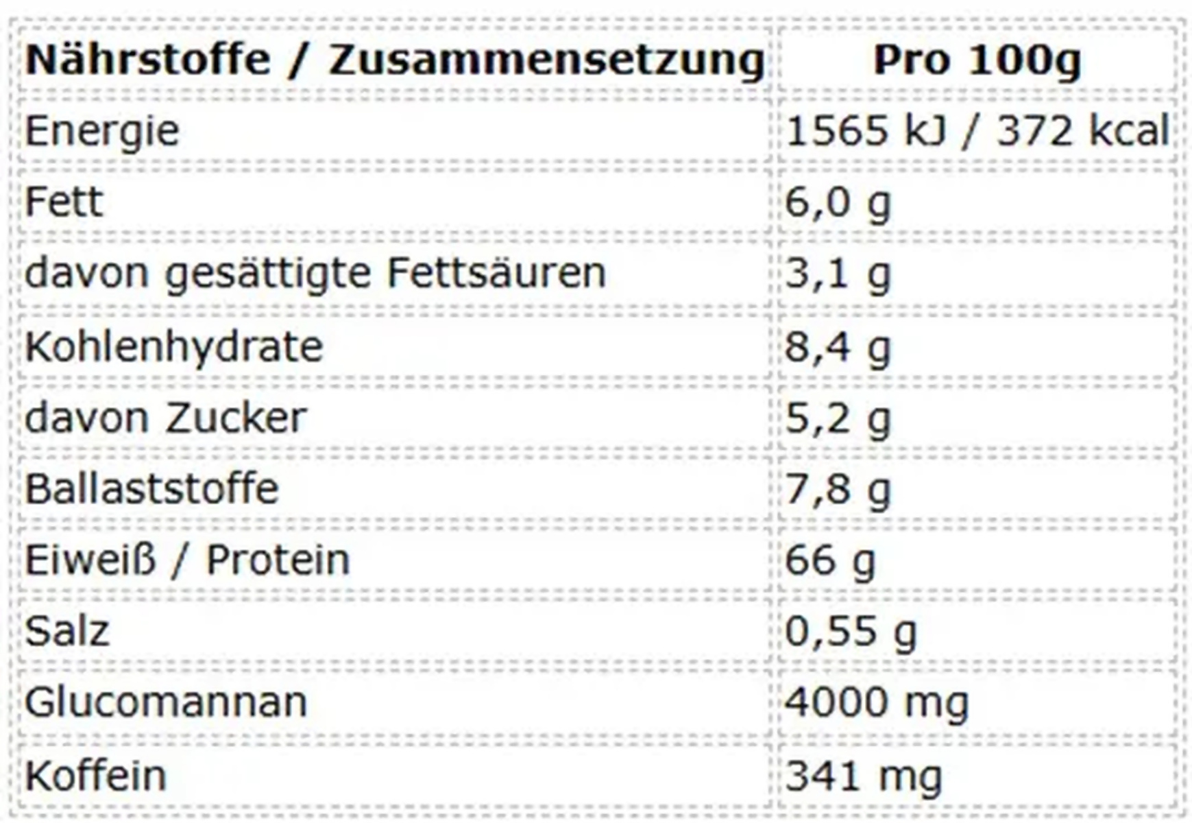 Nährstoffe / Zusammensetzung Pro 100g/ml Zubereitung Energie 218 kJ / 52 kcal Fett 1,3 g davon gesättigte Fettsäuren 0,4 g Kohlenhydrate 3,7 g davon Zucker 0,5 g Ballaststoffe 1,3 g Eiweiß / Protein 5,7 g Salz 0,05 g Glucomannan 333 mg Koffein 23 mg