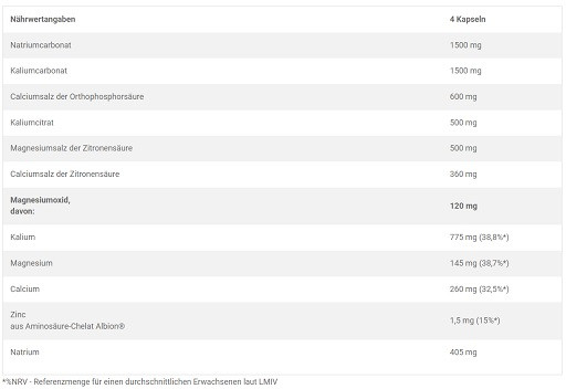 Natriumcarbonat, Kaliumcarbonat, Calciumsalz der Orthophosphorsäure, Kaliumcitrat, Magnesiumsalz der Zitronensäure, Calciumsalz der Zitronensäure, Magnesiumoxid, Füllstoff: mikrokristalline Cellulose; Trennmittel: Magnesiumstearat; Zinkbisglycinat; Kapsel: Gelatine, Farbstoff: E 171.