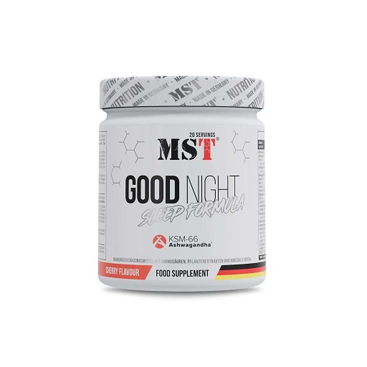 MST GOOD NIGHT ist ein Nahrungsergänzungsmittel mit einer Kombination aus Aminosäuren, Pflanzenextrakten sowie Vitaminen und Mineralstoffen. Die Pulverform wird in Wasser gelöst und ist für die Einnahme am Abend vorgesehen.