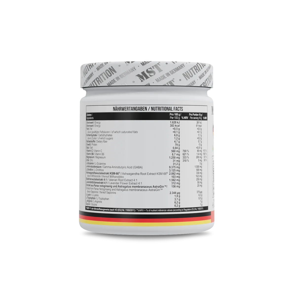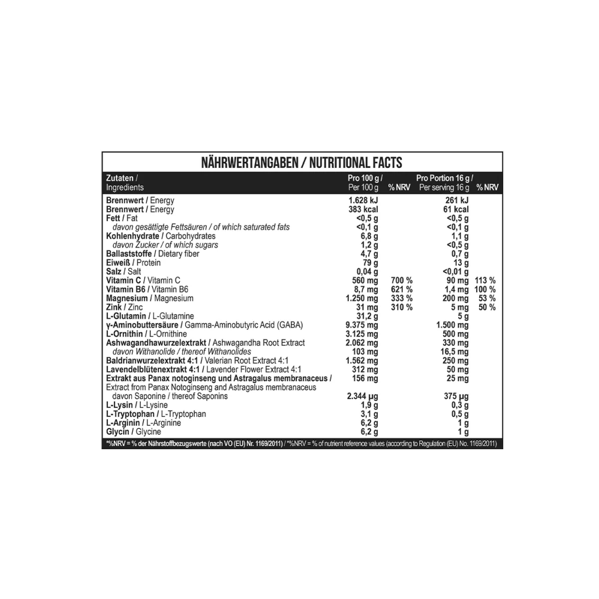Nährwertangaben pro Portion (16 g): • GABA – 1.500 mg • L-Glutamin – 5.000 mg • L-Ornithin – 1.500 mg • L-Theanin – 100 mg • KSM-66® Ashwagandha Extrakt – 300 mg • Lavendelextrakt 4:1 – 40 mg • AstraGin Panax Notoginseng & Astragalus membranaceus – 25 mg • Vitamin C – 60 mg (70 % NRV) • Vitamin B6 – 1,5 mg (107 % NRV) • Magnesium – 250 mg (67 % NRV) • Zink – 10 mg (100 % NRV) • L-Tryptophan – 200 mg • L-Arginin – 1.000 mg