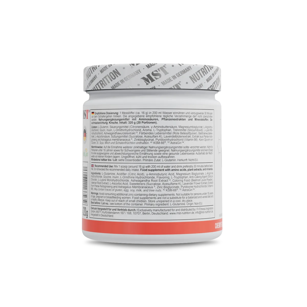 L-Glutamin, Säuerungsmittel (Citronensäure), γ-Aminobuttersäure, Magnesiumbisglycinat, L-Argininhydrochlorid, Glycin, Inulin, L-Ornithinhydrochlorid, Aroma, L-Tryptophan, Trennmittel (Siliciumdioxid), L-Lysin-Monohydrochlorid, Ashwagandhawurzelextrakt a, Färbendes Lebensmittel (Rote Betesaftpulver), Baldrianwurzelextrakt, L-Ascorbinsäure, Süßungsmittel (Sucralose, Acesulfam K), Lavendelblütenextrakt, Extrakt aus Panax notoginseng und Astragalus membranaceus b, Zinkbisglycinat, Pyridoxinhydrochlorid a) KSM-66, b) AstraGin™