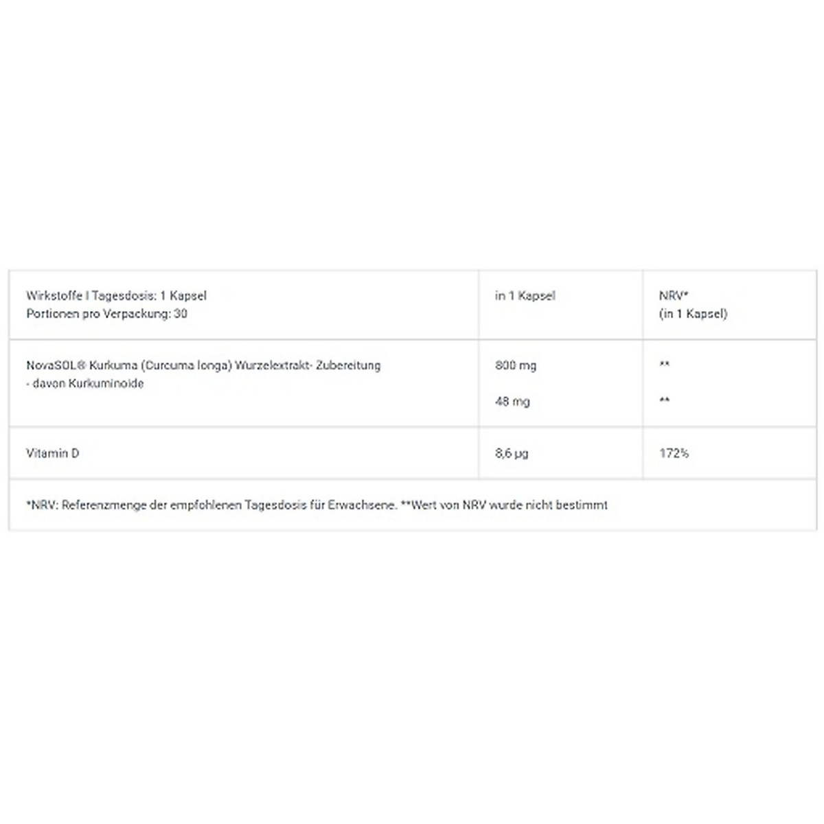 Wirkstoffe I Tagesdosis: 1 Kapsel Portionen pro Verpackung: 30 in 1 Kapsel NRV* (in 1 Kapsel) NovaSOL® Kurkuma (Curcuma longa) Wurzelextrakt- Zubereitung - davon Kurkuminoide 800 mg 48 mg ** ** Vitamin D 8,6 µg 172% *NRV: Referenzmenge der empfohlenen Tagesdosis für Erwachsene. **Wert von NRV wurde nicht bestimmt