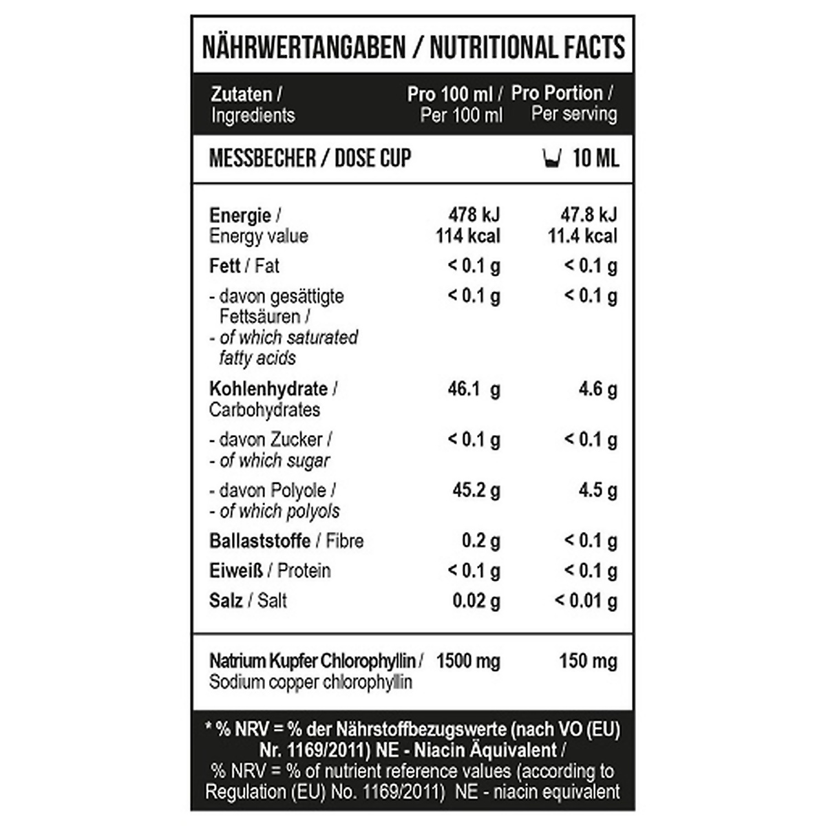 Nährwertangaben: Pro 100 g Pro Portion (10 ml) Energie 478 kJ/ 114 kcal 47,8 kJ/ 11,4 kcal Fett < 0,1 g < 0,1 g - davon gesättigte Fettsäuren < 0,1 g < 0,1 g Kohlenhydrate 46,1 g 4,6 g - davon Zucker < 0,1 g < 0,1 g Ballaststoffe 0,2 g < 0,1 g Eiweiß < 0,1 g < 0,1 g Salz 0,02 g < 0,01 g Natrium Kupfer Chlorophyll 1500 mg 150 mg