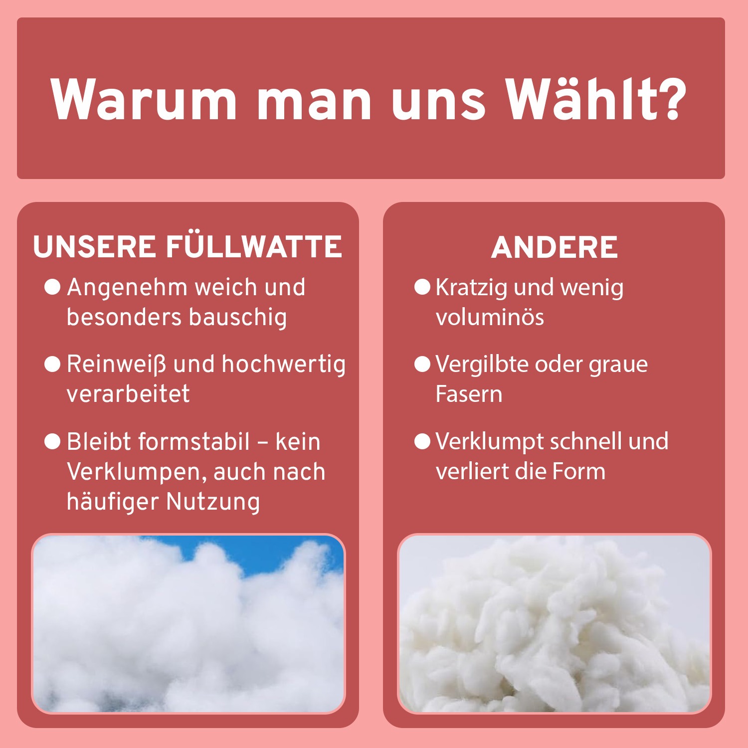 Unsere hochwertige Füllwatte aus 100 % Polyester sorgt für eine bauschige, gleichmäßige Füllung ohne Verklumpen. Perfekt für Kissen, Kuscheltiere, Sitzsäcke & Bastelprojekte.