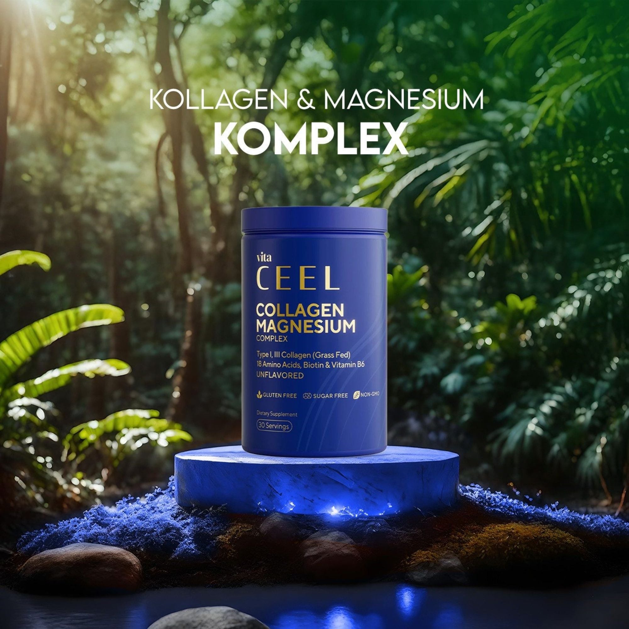 Vita Ceel Collagen Magnesium Complex kombiniert Typ I & III Kollagen (Grass Fed) mit Magnesium, Biotin, Vitamin B6 und 18 Aminosäuren in geschmacksneutralem Pulverformat. Die Zusammensetzung ist ideal für die tägliche Ergänzung.